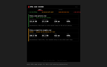 インターフェースはユーザーフレンドリーで、経験豊富な開発者とウェブ最適化に新しい人々の両方がアクセスできるようになっています。重要なパフォーマンス指標に焦点を当てたHTMLサイズチェッカーは、サイトのSEOと全体的な効率を向上させたい人にとって貴重なリソースとして機能します。このアドオンは、ウェブ開発における競争力を維持するための必須ツールです。